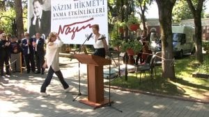 На мемориальной церемонии, посвященной 50-й годовщине смерти поэта Назыма Хикмета, писательница и журналистка Зейнеп Орал выступила с речью.